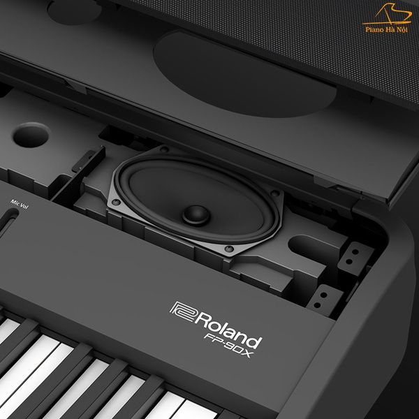 Piano Roland FP90X còn vô cùng ấn tượng khi sở hữu dải rộng âm thanh lớn nhờ cặp loa trầm mạnh mẽ và loa tweeter vòm đôi. Những lỗ thông hơi ở mặt sau của thùng loa giúp âm thanh phát ra hay, chuẩn xác và bao trùm khắp căn phòng. Vì thế, bạn có thể chơi đàn tại nhà hoặc tham gia biểu diễn trên sân khấu với Piano Roland FP90X đều rất tuyệt vời.